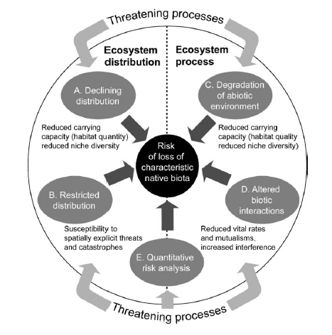 - Criterion E: allows for the integration of the above four symptoms into a simulation model of ecosystem dynamics to allow quantitative estimates of the risk of ecosystem collapse.
